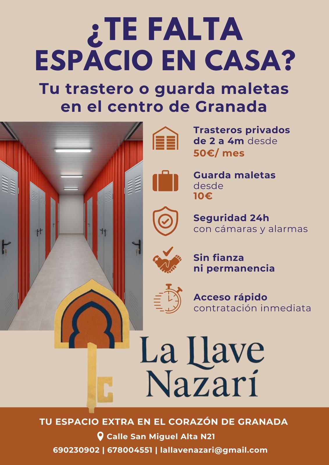 Trasteros La Llave Nazarí ofrece trasteros en alquiler en Granada con acceso 24 horas, abierto fines de semana y acceso los 365 dias del ano. Ubicado en C. San Miguel Alta, Granada.