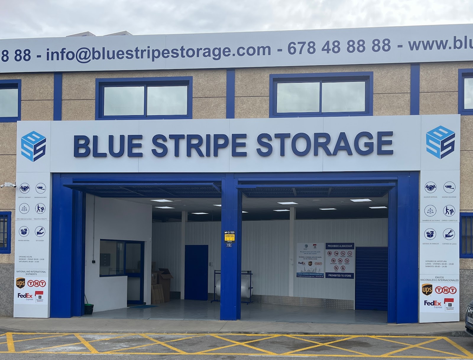 Blue Stripe Storage offers a variety of storage services and solutions in Marbella. Self storage units for personal items and business storage units catering for larger stock areas. Units from 2m² to 64m² with 3m high ceilings. 24/7 CCTV security. Additional services include wine storage, file/document storage, and sports equipment storage.